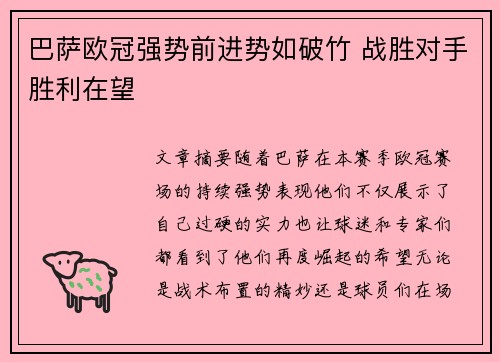 文章摘要:随着巴萨在本赛季欧冠赛场的持续强势表现,他们不仅展示了自己过硬的实力,也让球迷和专家们都看到了他们再度崛起的希望。无论是战术布置的精妙,还是球员们在场上的默契配合,巴萨都以势如破竹之势逐渐走向胜利的终点。通过对其在进攻、组织、防守以及关键球员发挥等方面的分析,本文将详细阐述巴萨在欧冠赛场上如何一步步战胜对手,最终赢得胜利,展现了他们重回欧洲之巅的强大潜力。巴萨的每一次胜利都充满了信心,展示出他们不仅仅是实力强大的球队,更是具有凝聚力和集体精神的典范。在接下来的比赛中,巴萨有望继续强势前进,直至最终问鼎欧冠。